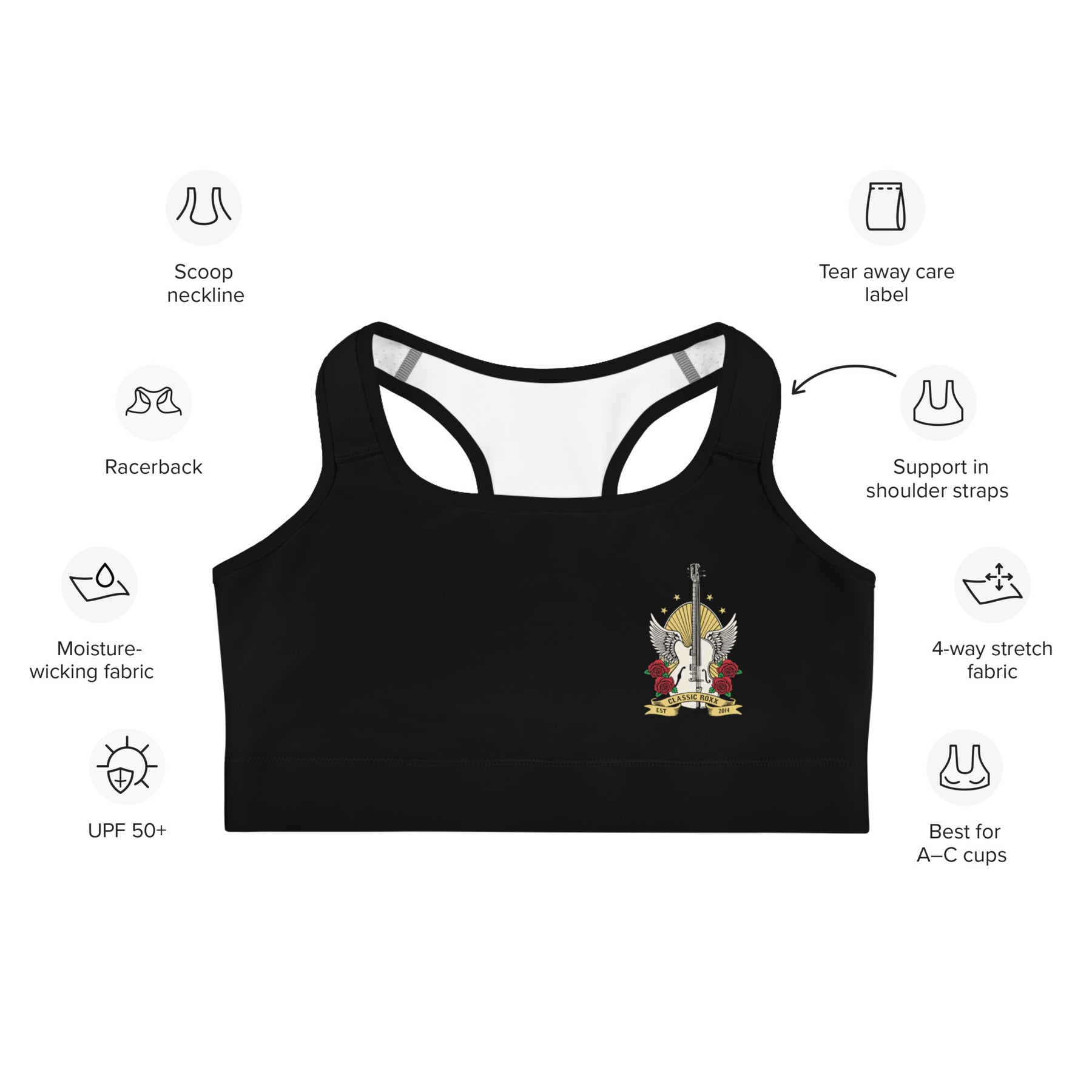 Dieser wunderschöne Sport-BH besteht aus feuchtigkeitsabsorbierendem Material, welches trocken bleibt bei leichten und mittelmäßig intensiven Trainings. Der BH hat stützendes Material in den Schulterträgern, eine doppellagige Vorderseite und ein breites Gummiband, um eine konstante Unterstützung zu gewährleisten.