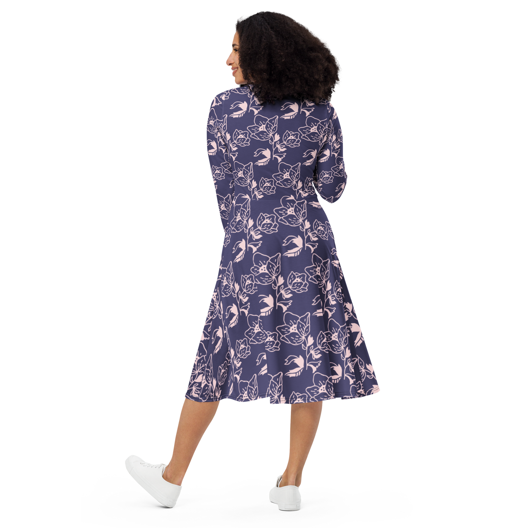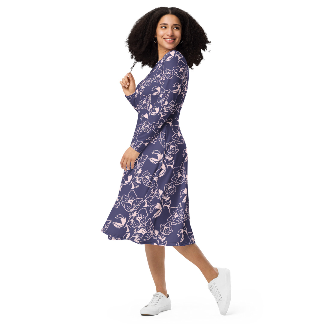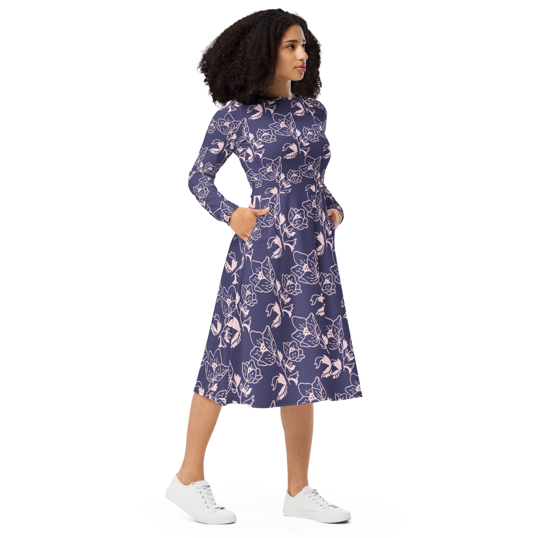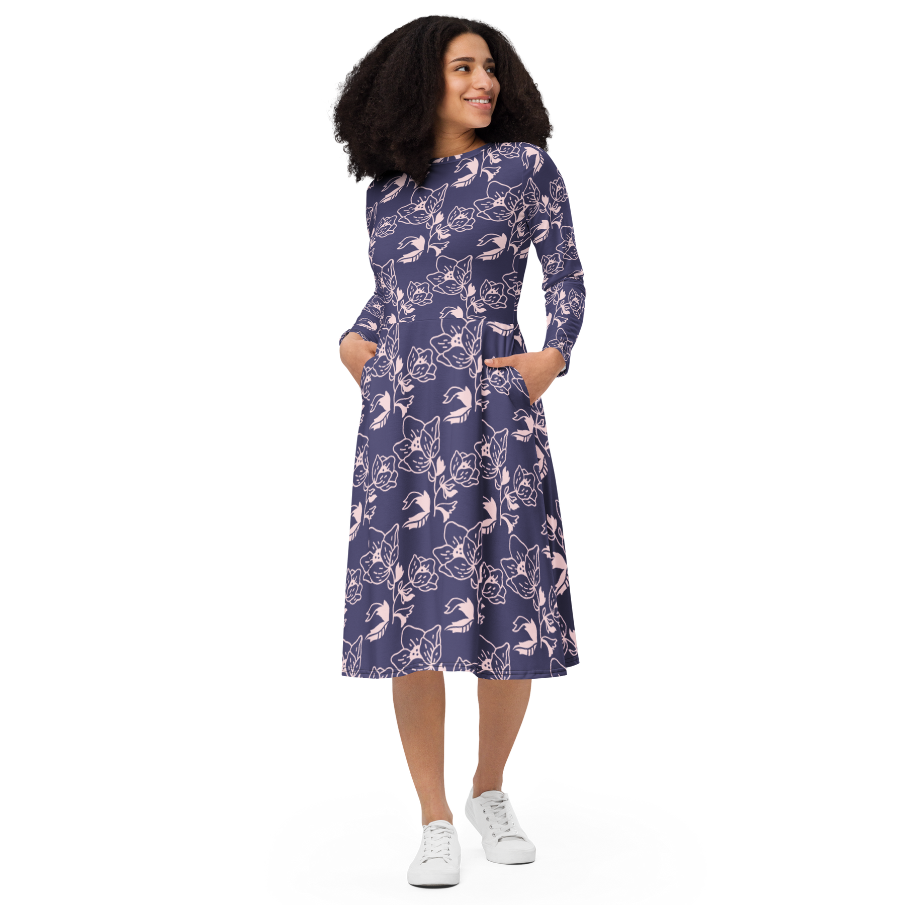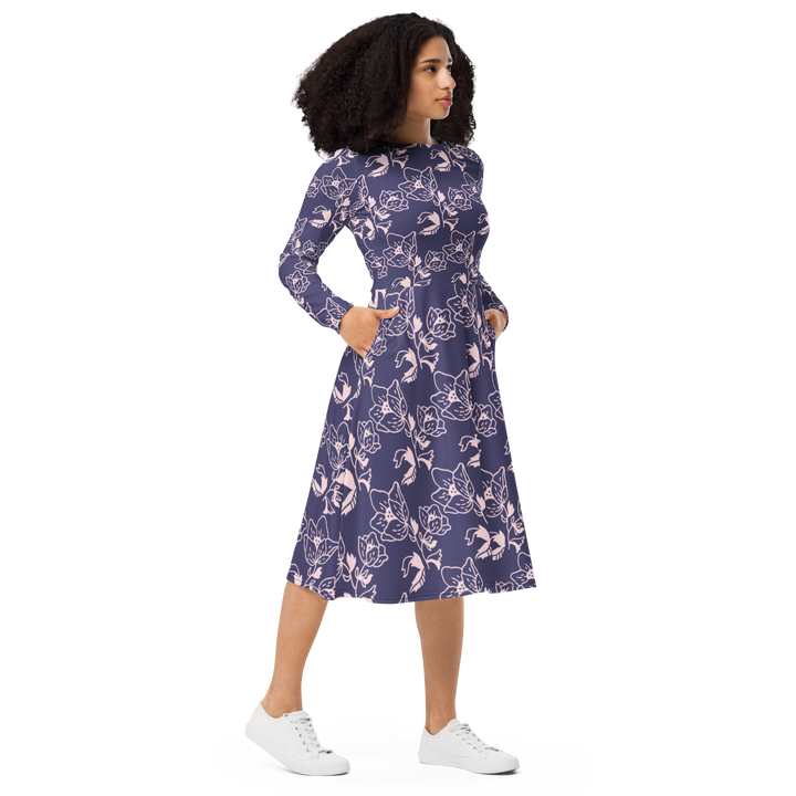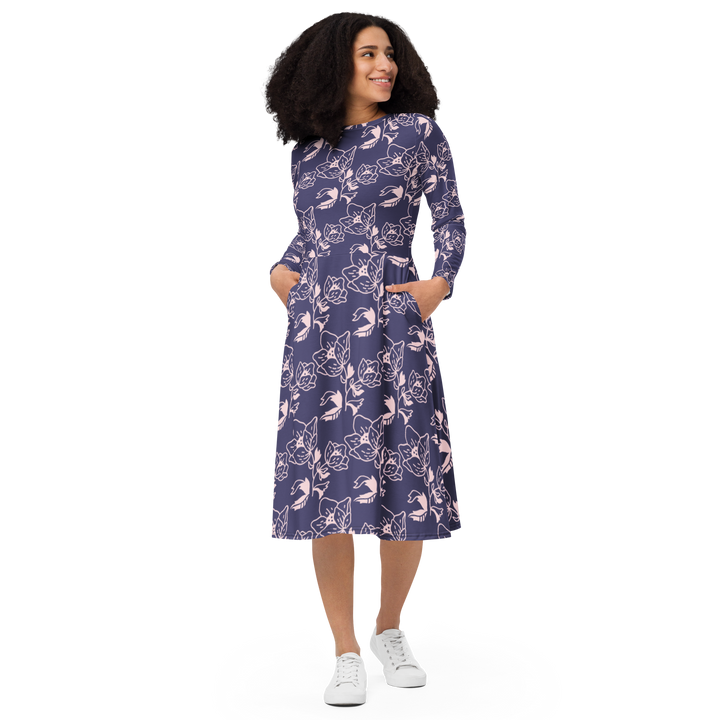 Long Sleeve Midi Dress with Pockets - Flora & Fauna 1
