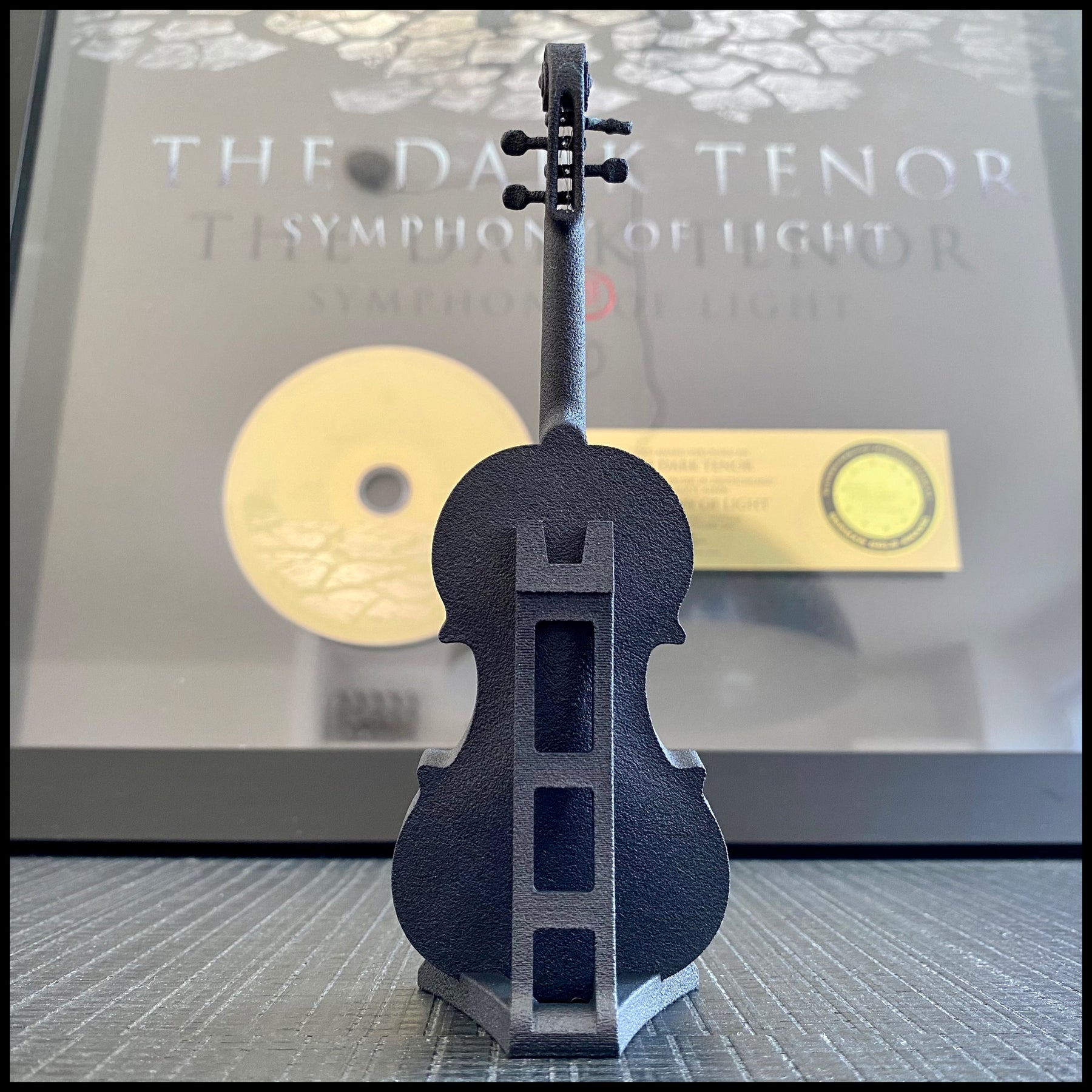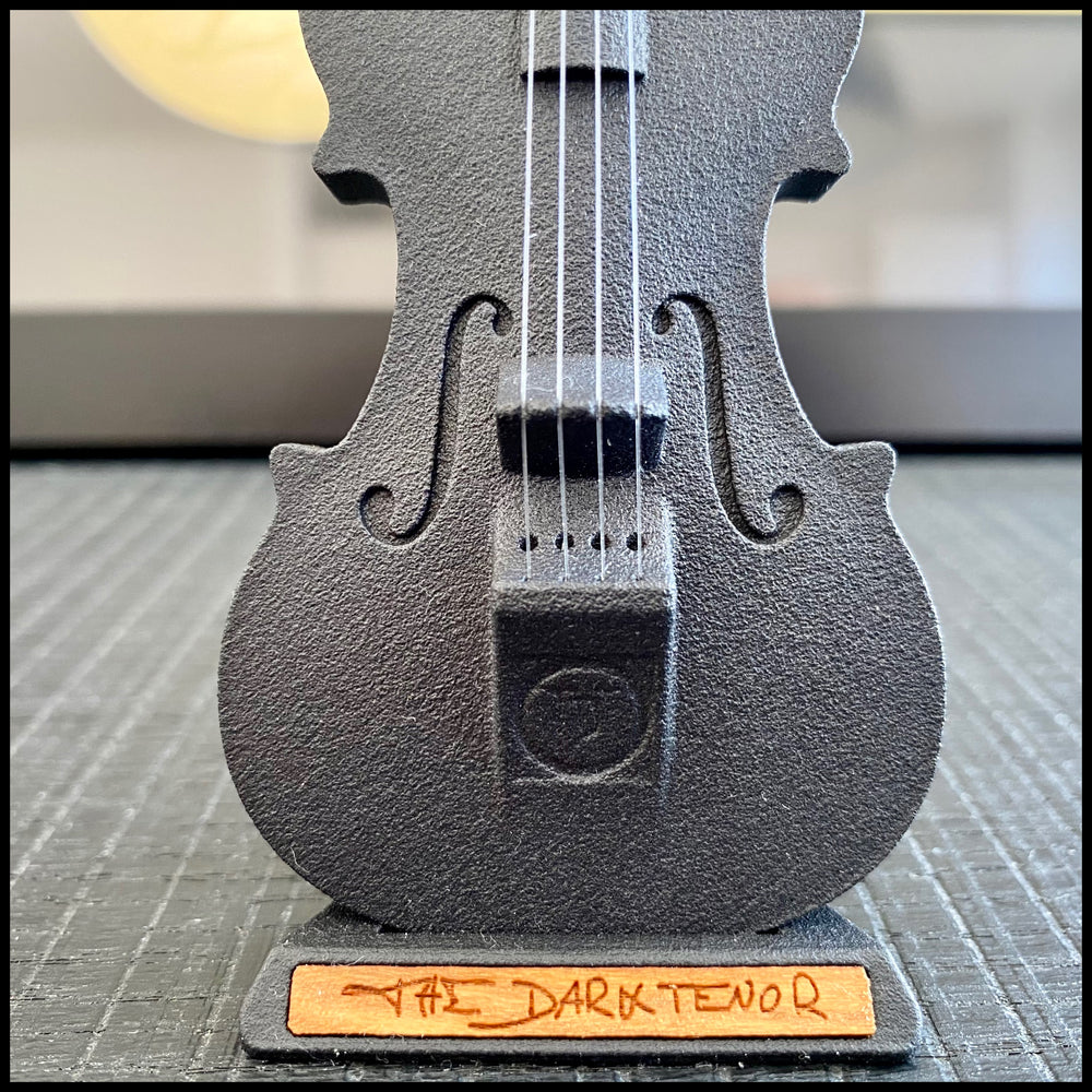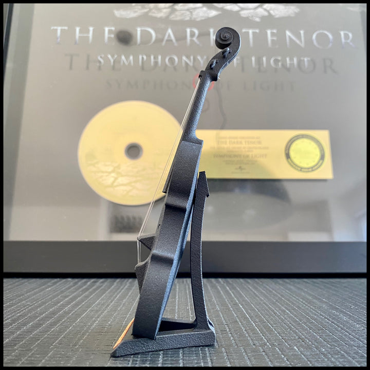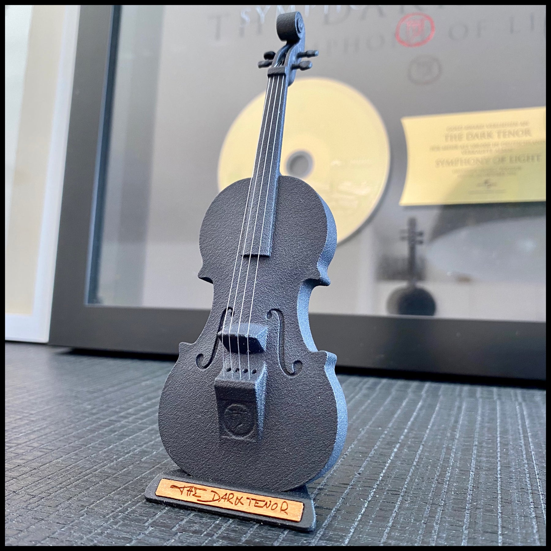 The Andrews decorative violin is manufactured in Berlin using a special 3D printing process according to Billy's specifications. In a classy matt black, it is perfect for the desk or to decorate your home with a rare accessory. The violin stands on a tripod that is manufactured using the same printing process. The strings are strung by hand and the pegs are glued by hand. The violin is adorned with the TDT coat of arms. "The Dark Tenor" is personally written by Billy and lasered into wood.