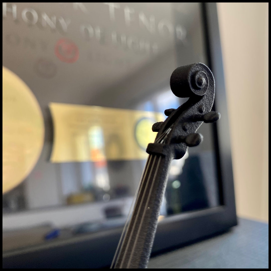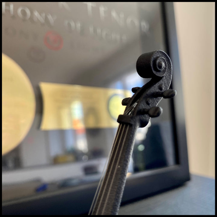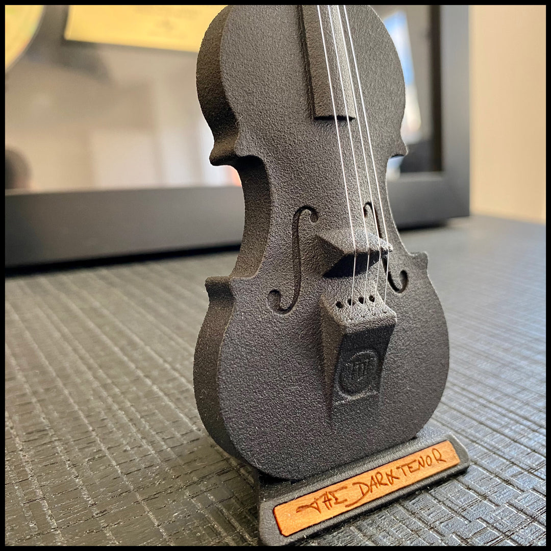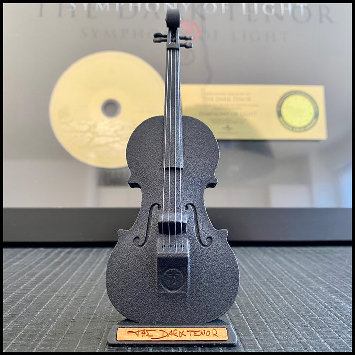 The Andrews decorative violin is manufactured in Berlin using a special 3D printing process according to Billy's specifications. In a classy matt black, it is perfect for the desk or to decorate your home with a rare accessory. The violin stands on a tripod that is manufactured using the same printing process. The strings are strung by hand and the pegs are glued by hand. The violin is adorned with the TDT coat of arms. "The Dark Tenor" is personally written by Billy and lasered into wood.
